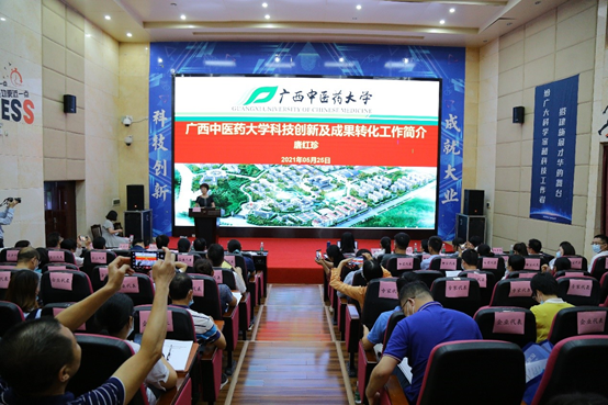 2021年5 月25日上午,2021年南宁市-广西中医药大学生物医药科技成果对接会在南宁市科技企业孵化基地召开。本次对接会由南宁市科技局、广西中医药大学主办。南宁市科技局局长梁展、副局长霍炳至,广西中医药大学成果转化与社会服务处处长唐红珍,科技处处长肖健,广西中医药大学项目路演推介的专家、团队及学校相关工作人员,南宁市各县区、开发区科技管理部门以及南宁市生物医药领域各企业管理员、技术负责人等参加了此次会议。