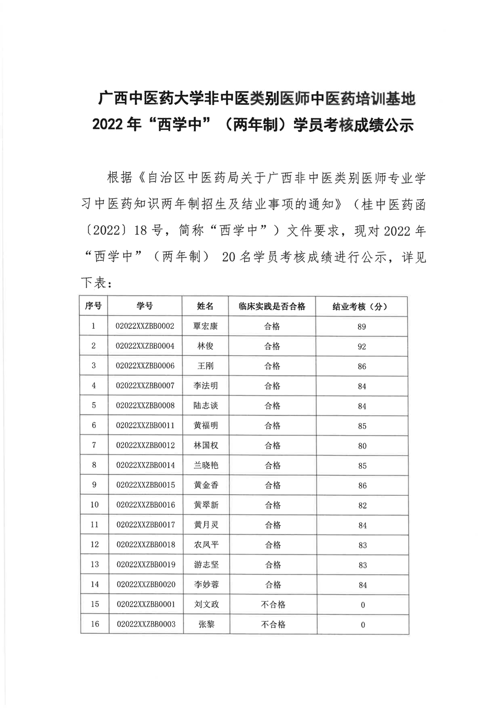 广西中医药大学非中医类别医师中医药培训基地2022年“西学中”(两年制)学员考核成绩公示