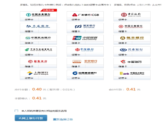 默认使用网银支付,选择银行图标,点击“到网上银行支付“登录网银支付