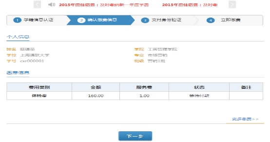 查看缴费详细内容,包括学生个人信息和费用信息等,信息确认后,点击”下一步”