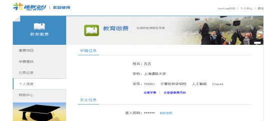登录后,确认学生的基本信息,确认无误后,点击“学费缴纳”,查看待缴费订单,页面如下(点击缴费项目,可查看学校发布的公共缴费项目)