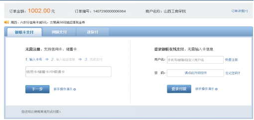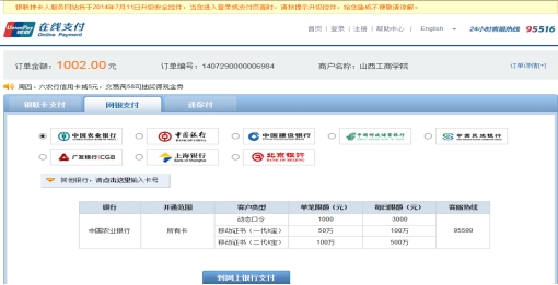 如持卡人未开通网银,可点击“银联卡支付”,按提示完成付款。(银行卡支付,单笔最高限额为5000元)