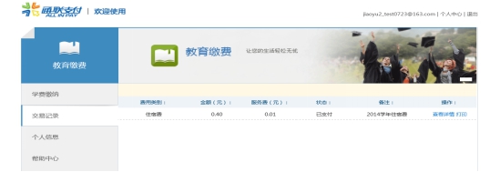 点击“交易记录”,查看缴费交易明细状态,如下所示:
