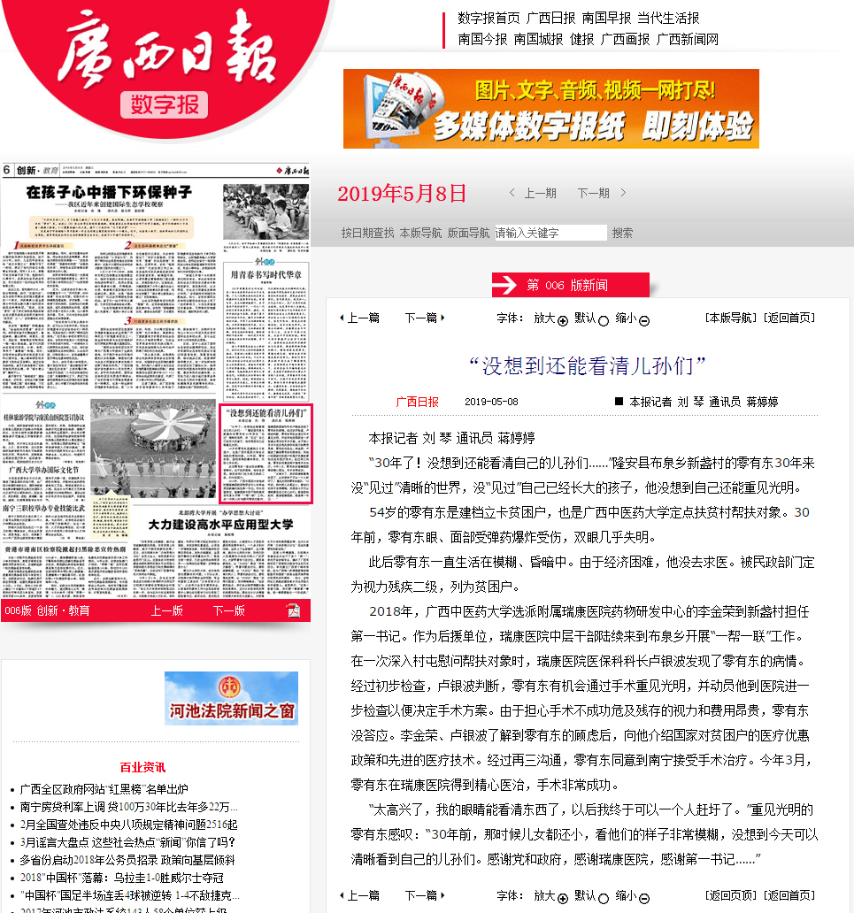 2018年,广西中医药大学选派附属瑞康医院药物研发中心的李金荣到新盏村担任第一书记。作为后援单位,瑞康医院中层干部陆续来到布泉乡开展“一帮一联”工作。在一次深入村屯慰问帮扶对象时,瑞康医院医保科科长卢银波发现了零有东的病情。经过初步检查,卢银波判断,零有东有机会通过手术重见光明,并动员他到医院进一步检查以便决定手术方案。由于担心手术不成功危及残存的视力和费用昂贵,零有东没答应。李金荣、卢银波了解到零有东的顾虑后,向他介绍国家对贫困户的医疗优惠政策和先进的医疗技术。经过再三沟通,零有东同意到南宁接受手术治疗。今年3月,零有东在瑞康医院得到精心医治,手术非常成功。