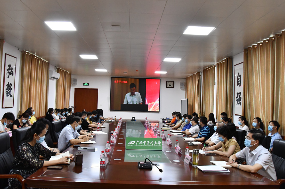 为庆祝第37个教师节,宣传优秀教师先进事迹,弘扬新时代尊师风尚,营造浓厚的尊师重教氛围,自治区高校工委、教育厅在南宁举办2021年全区优秀教师先进事迹报告会。学校党委副书记庞宇舟参加教育厅主会场报告会。我校在仙葫校区合德楼525会议室设立分会场,学校党委副书记何并文、副校长冷静、纪委书记韦雪芳、总会计师何刚亮,各相关职能部门负责人,各学院、教学部负责人和教师代表,部分学生代表共50多人一同观看了报告会。