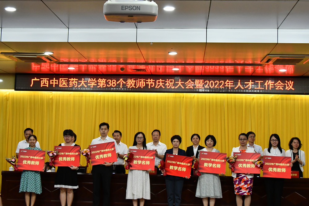 9月9日下午,在教师节到来之际,广西中医药大学第38个教师节庆祝大会暨2022年人才工作会议在仙葫校区图书馆第二会议室举行。会议表彰在教育教学方面成绩突出的优秀教师代表、高层次人才及团队代表,弘扬尊师重教的良好风尚,同时对学校人才工作进行总结分析和部署下一步人才工作。