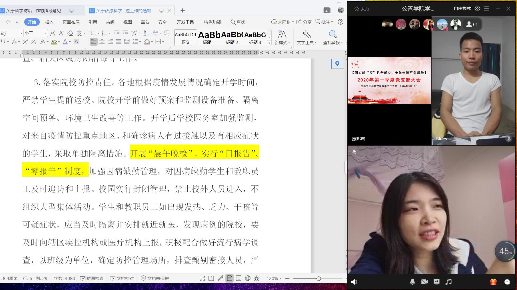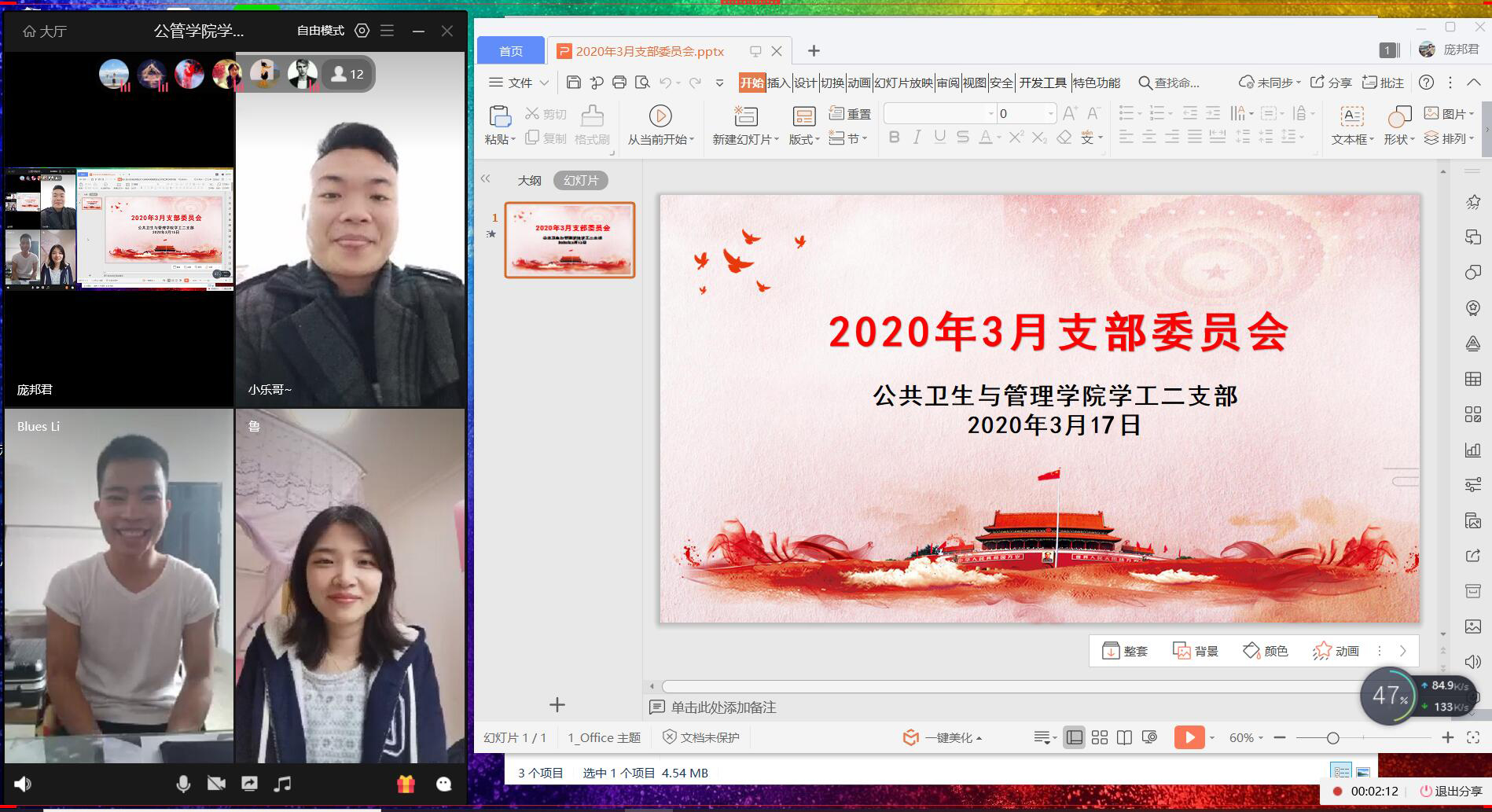 2020年3月17日15:00,公共卫生与管理学院学工二支部以网络直播形式开展了2020年第一季度支部大会暨3月支部委员会,支部书记鲁蕴律及全体党员、预备党员参加本次会议,会议由支部副书记庞邦君主持。