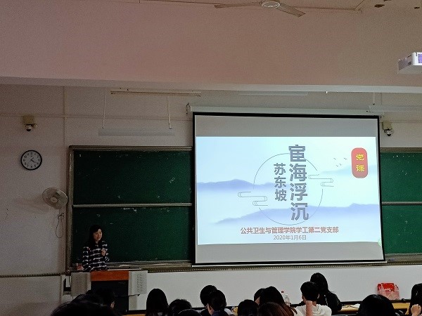 会议议程第二项,由支部副书记庞邦君进行党课教育。本次党课教育围绕“宦海沉浮——苏东坡”的故事开展,庞邦君分四章讲解苏东坡的一生,通过讲解苏东坡济世为民之初衷、与民同乐之情怀、乐观旷达之性情、多方涉猎之情趣,教导在座党员作为当代党员干部,更当学做“苏东坡”式党员干部,练就过硬本领,济世为怀,与民同乐,永远乐观旷达,兢兢业业,争做有人格魅力的公管学干。