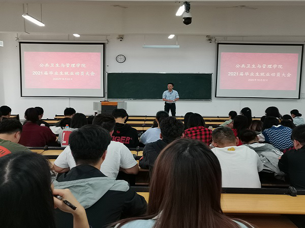 10月22日下午,公共卫生与管理学院在教学楼1-107召开2021届毕业生就业动员大会,我院2021全体届毕业生以及团委书记鲁蕴律参与本次会议,会议由学生工作办公室主任宋南主讲。