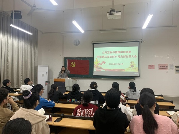 公共卫生与管理学院党委学生第三党支部于11月25日下午 17:30在教学楼1-112教室召开11月支部党员大会,本次大会由支部书记唐梧茜主持,学习党的二十大精神和习近平总书记参加广西代表团讨论时的重要讲话精神,支部全体党员参加本次大会。