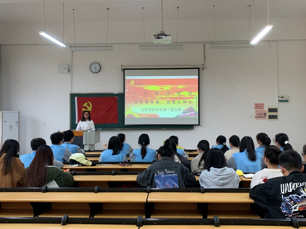 为深入学习领会习近平总书记在党的二十大报告中提出的关于“推进文化自信自强,铸就社会主义文化新辉煌”的新部署新要求,增强文化自信、历史自信,4月9日下午公共卫生与管理学院学生第二党支部于仙葫校区教学楼2-210组织全体党员和入党积极分子开展“文化有大美,自信以持之”主题党日活动,本次活动由支部副书记曾梅娇主持。