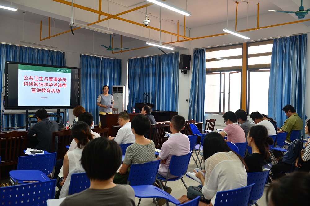 公共卫生与管理学院召开科研诚信和学术道德宣讲教育 发布时间:2018-10-10 10:15:12 浏览次数: 次 【字体:小 大】 2018年10月9日下午,公共卫生与管理学院在自诚楼A801组织召开了科研诚信和学术道德宣讲教育活动。活动由科研办主任韦俞伽主持,全体教职工参加了此次活动。 韦俞伽主任针对广西中医药大学教职工学术诚信承诺书进行了详细解读。董柏青院长特别强调各位老师一定要认真阅读承诺书内容,以严谨求实的态度进行学术研究,发扬实事求是的科研精神,认真履行科学研究的义务,严格恪守承诺,并相互监督。 分享到: 【打印正文】