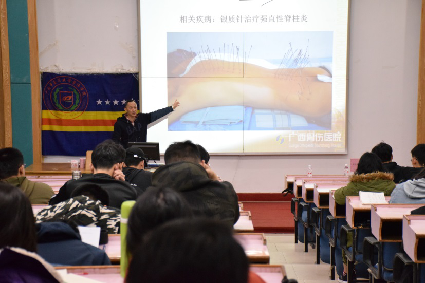 2019年3月24日19:30 , 广西中医药大学明秀校区西梯一教室 , 广西骨伤医院 颈椎腰腿痛科·骨伤康复科 安平 主任 给 骨伤学院师生 带来 题为 “中医瑰宝-银质针” 的 讲座 。 骨伤 学子 齐聚一堂共同聆听与探讨其中魅力,骨伤学院院长周红海 教授 , 学办主任 温健老师出席本次讲座。