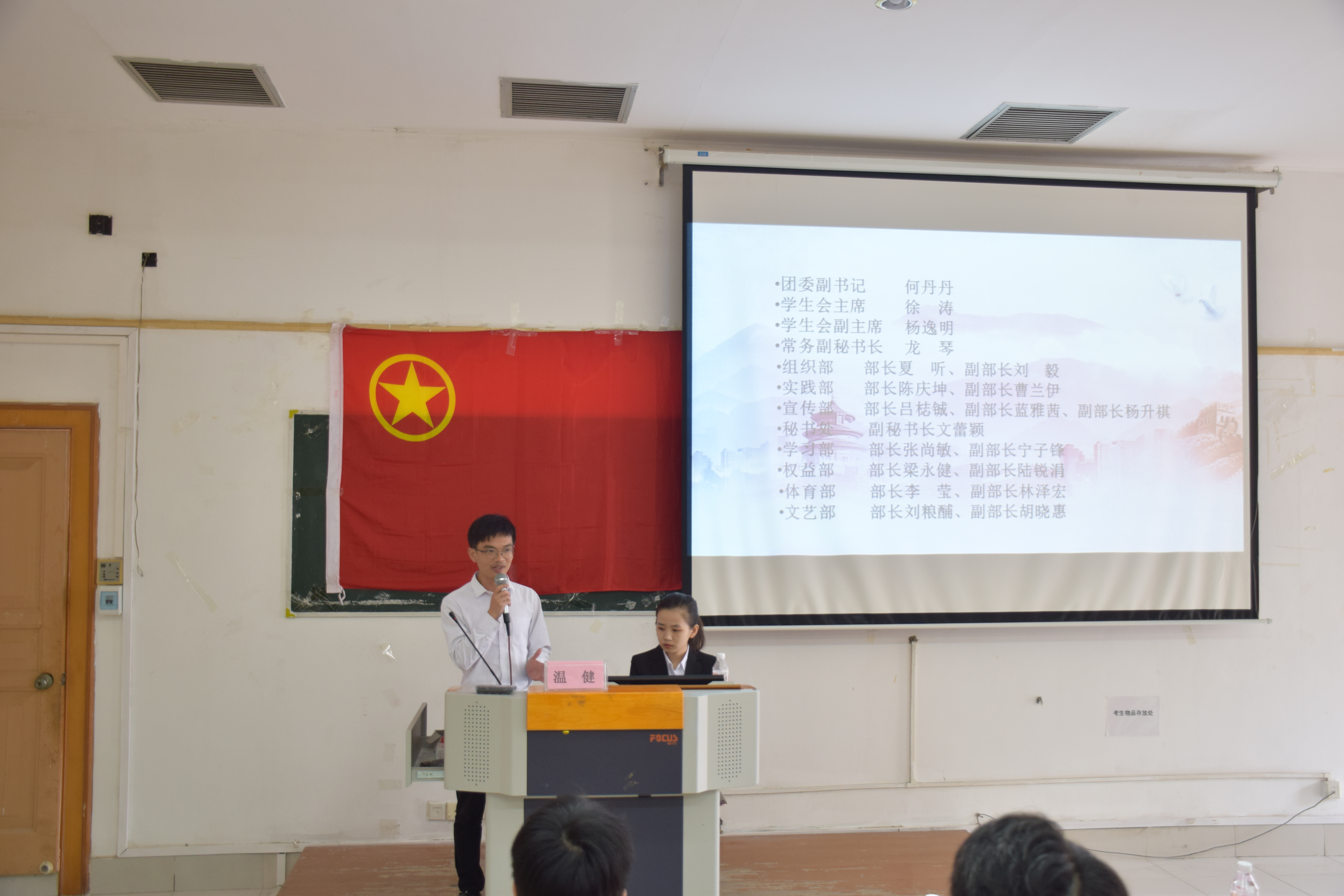 大会在主持人的致辞中拉开了序幕。团委学生副书记胡梦婷、学生会主席刘柏杰先后对上学年的工作做了激情洋溢的总结。随即,田君明老师、刘渊老师、温健老师先后上台对上一学年的工作进行总结并对下一年的工作进行安排,发表了对上一届团委学生会干部积极认真工作态度的认可与表扬,且由温健老师宣布第六届团委学生会干部任职名单,并表现出对下一届团委学生会干部的热切期望。接下来,温健老师、田君明老师、刘渊老师分别为上一届团委学生会干部颁发聘书。之后,新一届团委学生副书记何丹丹和学生会主席徐涛上台发言,对新一年团委学生会的工作做出新的展望,最后,主持人宣布本次换届大会圆满结束,各个参会人员合影留念。
