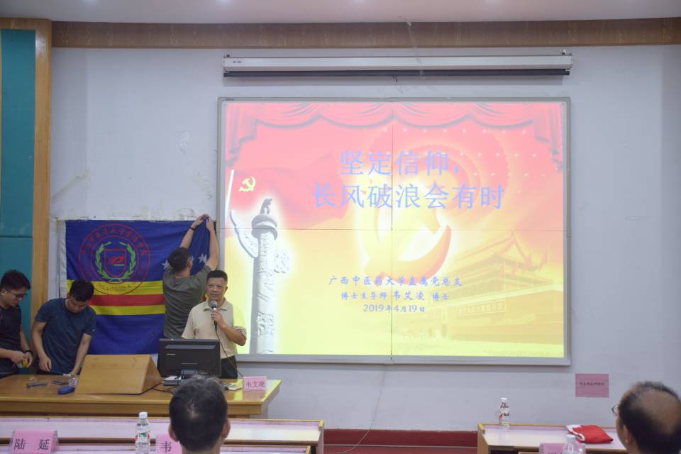 2019 年 5 月 19 日 19 : 30 ,直属党总支韦艾凌书记于广西中医药大学明秀校区西梯一教室为骨伤学院全体师生上了一场精彩的 主 题党课。本次党课到场的有骨伤学院院长周红海 教授 、 副院长周学龙教授、韦明老师、温健老师、刘渊老师、陆延老师 以及 2015 级中医骨伤班全体成员和 2016 级中医骨伤班全体成员。