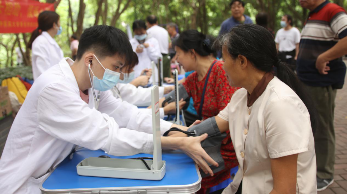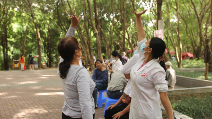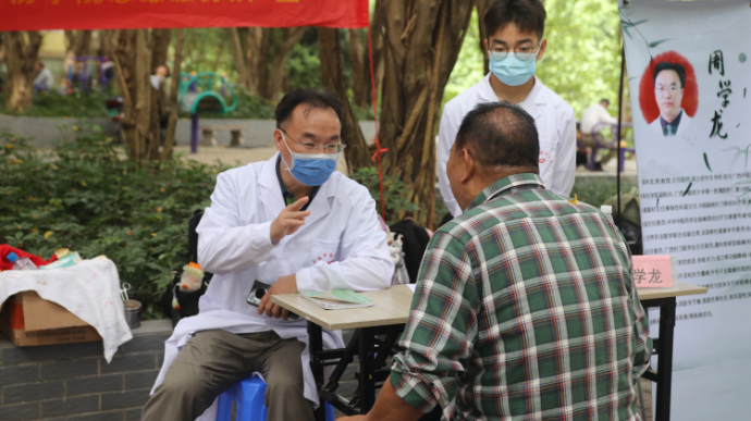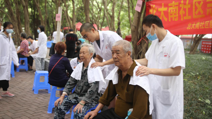 推、拿、按、摩、摸、接、端、提,正骨八法或生涩、或熟练地被老师与志愿者们运用,为有身体不适的社区居民缓解病痛;血糖仪、血压计、还有一个听诊器,在志愿者手中便成了为社区居民体检的“神兵利器”,帮助检测社区居民的健康状况;针灸针、艾灸条,在社区居民穴位上一用,便让疾痛得以缓解,身体得以放松。这系列的热心服务进行后赢得了众多社区居民的称赞。