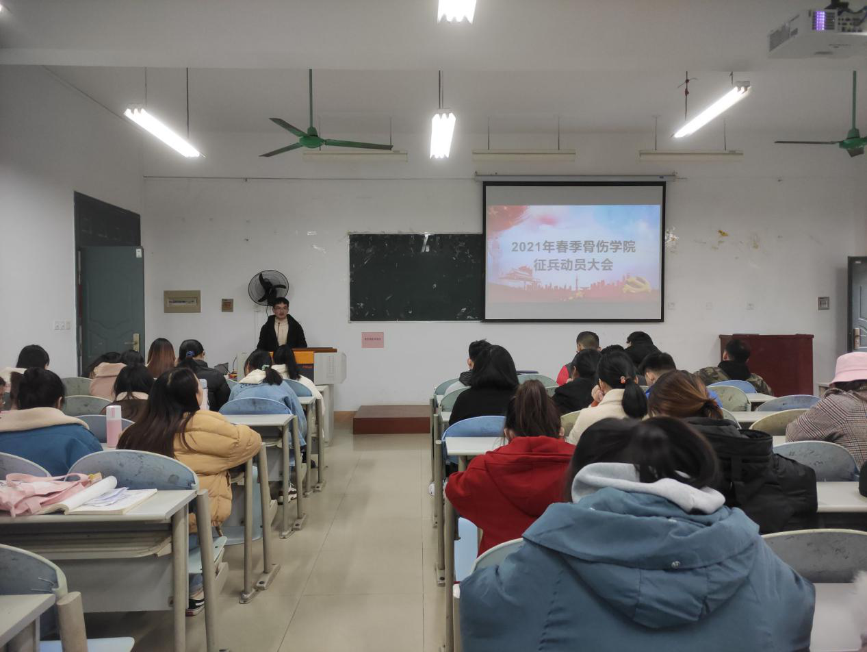根据《广西中医药大学2021年春季征兵工作方案》文件的精神,骨伤学院2021年1月13日于明秀东新东一教室召开2021年春季征兵动员大会。会议由骨伤学院温健老师主持,在会上,温老师向同学们转达了上级的征兵工作精神,细致为同学解读相关征兵工作文件、报名步骤、优待办法等,鼓励有志参军入伍,报效祖国的同学积极报名。通过本次大会,同学们了解知悉了报名参军的各项相关政策,有利于推动今后的征兵工作。