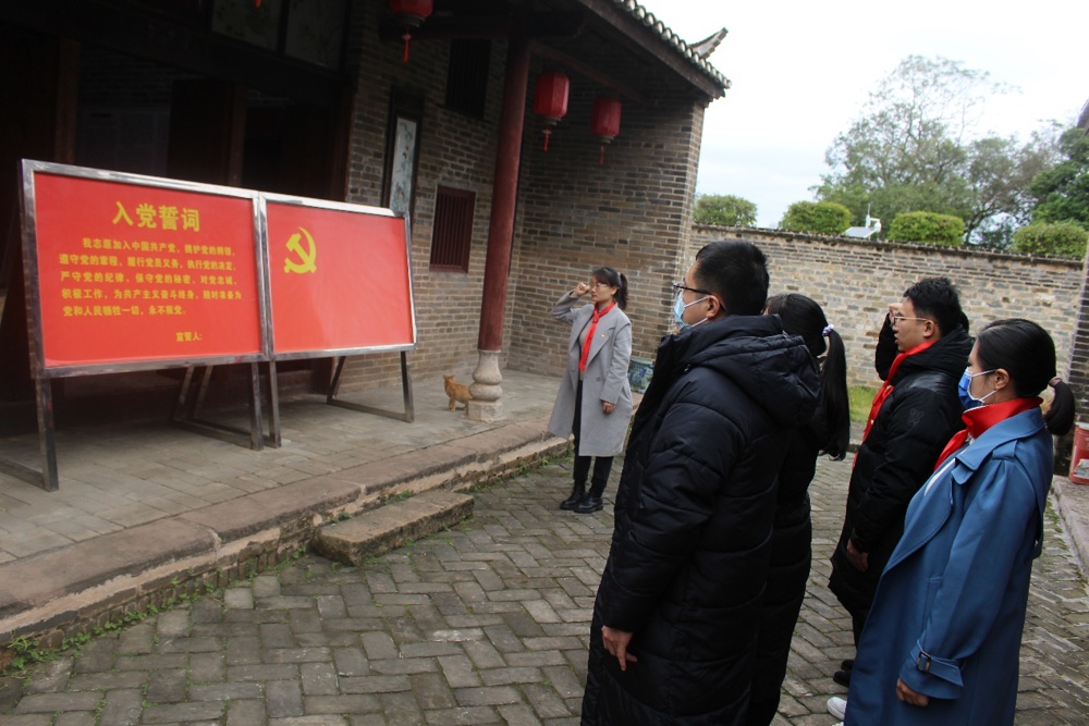 在林景云烈士故居里,支部同志认真聆听了一堂特殊的党课,党课由林景云烈士的外孙女亲自讲授,她深情讲述了林景云烈士的英雄事迹,带领着党员们重温那段红色历史,感受中国共产党革命成立初期的艰辛和壮烈。当听到林景云在风华正茂之时毅然弃笔从戎,为中国革命事业不懈奋斗,最终为掩护大部队撤离保存革命实力而献出了年仅28岁的生命时,在场的老师和同学无不潸然泪下,为他用生命书写对党的忠诚的而敬佩和感动。党课过后,学生第二党支部书记覃梦岚老师带领预备党员在党旗面前进行庄严宣誓,全体成员重温入党誓词。