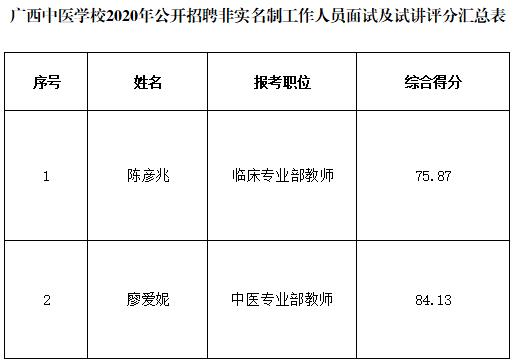 广西中医学校(广西中医药大学附设中医学校)2020年公开招聘非实名制工作人员面试成绩及试讲成绩公告 发布时间:2020-05-25 10:11:02 浏览次数: 次 【字体:小 大】 根据《广西中医学校(广西中医药大学附设中医学校)2020年公开招聘非实名制工作人员符合条件人员公示》,学校于2020年5月21日上午对应聘人员进行面试及试讲,现将成绩公示如下,请各位考生自行查阅。 2020年5月22日 分享到: 【打印正文】