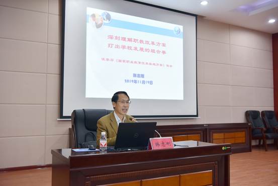 11月19日下午,高职院、附设中医学校在北湖校区多功能报告厅举行“不忘初心、牢记使命”形势政策教育专题报告会,广西工业职业技术学院党委书记韩志刚受邀作了题为《深刻理解职教改革方案 打出学校发展的组合拳》的专题报告。