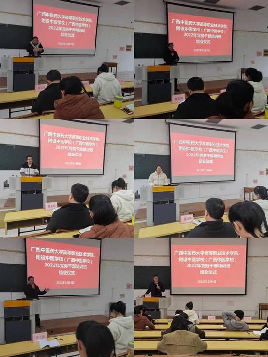 此次培训主要以理论教学现场授课的形式开展,邀请了广西中医药大学校办主任蓝开宝、广西中医药大学马克思主义学院院长韦兆均、副院长李源、副教授奚亚丽以《公文写作与处理》《中国式现代化推进中华民族伟大复兴》《新时代背景下把党建设得更加坚强有力》《加强全过程人民民主》等为题的专题授课。通过运用朴实的语言、生动详实的事例,准确、全面的为学员们讲解,并与学员进行了面对面交流,深刻解读了学习贯彻党的二十大精神,加强党支部工作和全面从严治党工作的重要性、紧迫性和必要性。