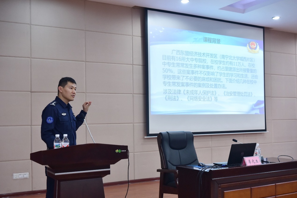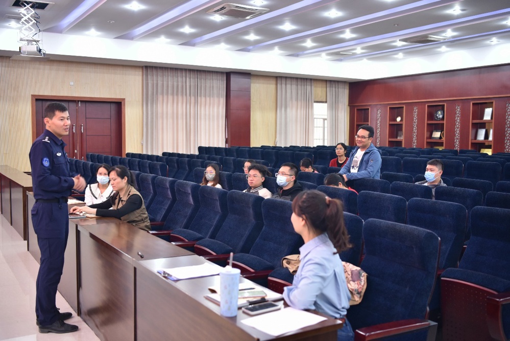 为帮助班主任在发生校园案件或者紧急突发事件时能快速正确地处置,减少或者避免校园案事件的发生,2023年12月12日下午 15:30,我校“中医五行德育”班主任工作室邀请了我校东盟校区辖区派出所,南宁市公安局里建派出所二级警长、东盟公安分局团支部书记、南宁市公安警校兼职教官李元生警官到我校北湖校区开展了“校园常见案事件及应急处置”讲座。“中医五行德育”班主任工作室全体成员、“青盾”校园法制教育工作站成员、全体班主任、学生科老师一起参加了讲座。