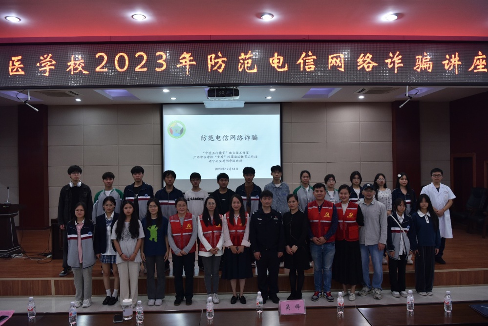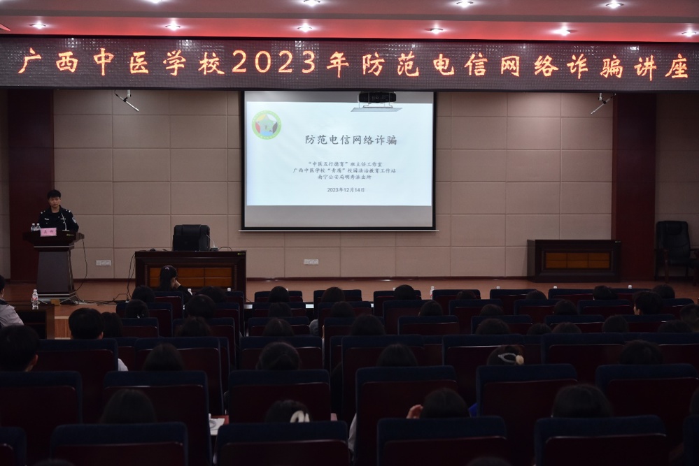 2023年12月14日晚7:00,我校“中医五行德育”班主任工作室、“青盾”校园法治教育工作站联合南宁市公安局明秀派出所在北湖校区多功能厅举办了一场反诈讲座,全校270名师生代表参加。