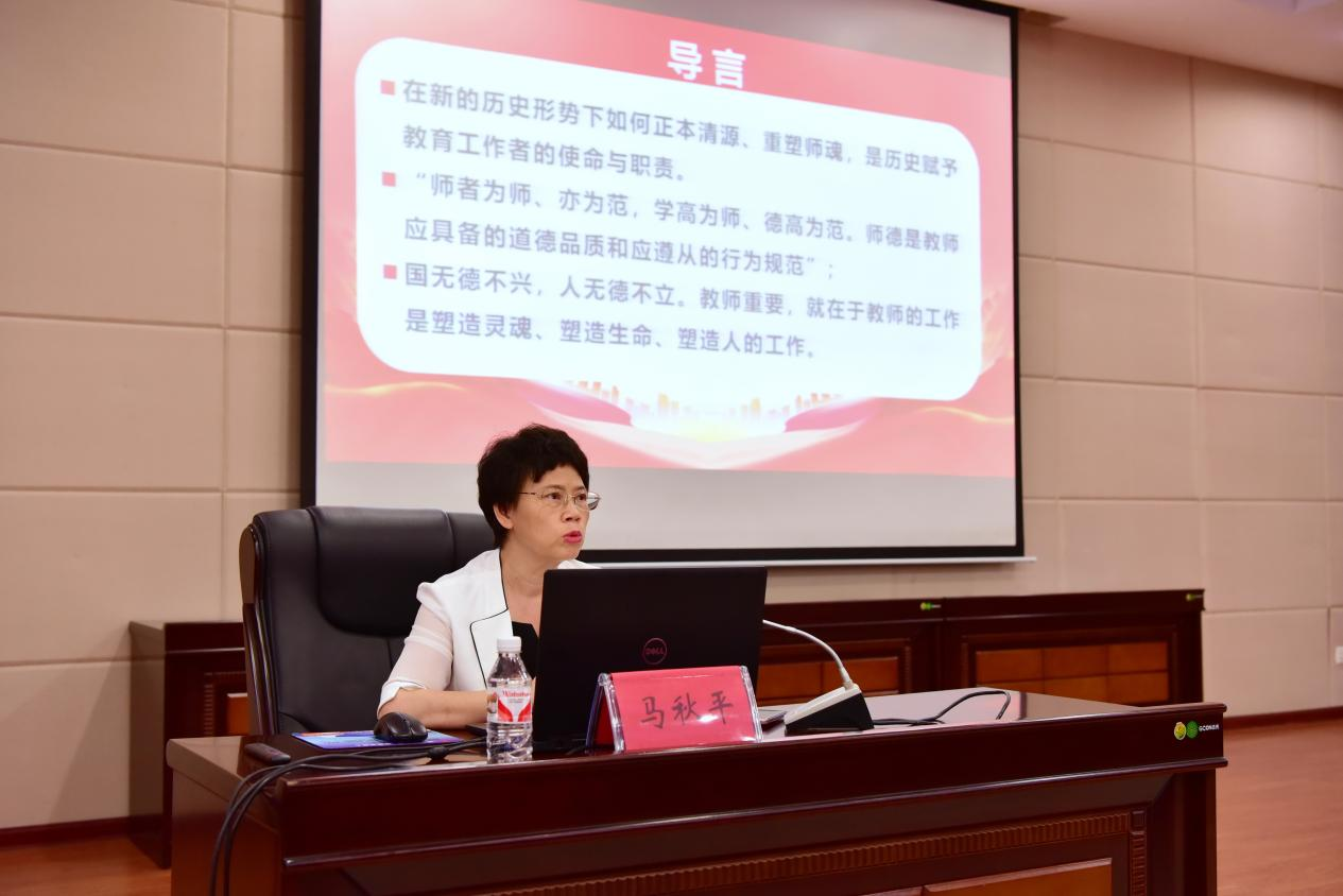 6月27日下午,高职院、附设中医学校党委副书记、院(校)长马秋平同志以 《坚守师德初心 铸牢师风根基 涵养教育情怀》为题,为院(校)教师带来一堂深刻生动的师德师风专题教育课。