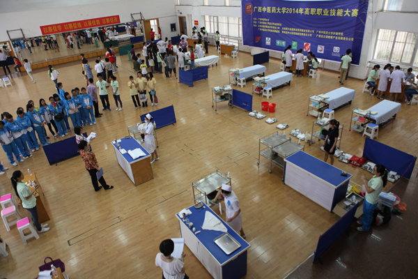 广西中医药大学2014年高职职业技能大赛于4月20日在明秀校区成功举办。学校副校长罗伟生,高职院党总支书记、院长、高职处处长邓远美、广西元之源健康产业有限责任公司总经理郭珉、大参林医药集团股份有限公司广西大区总监陈洪、柳州桂中大药房连锁有限责任公司副总经理邓瑞太、云南健之佳健康连锁店股份有限公司质量管理部经理何鹏、广西中医药大学附属瑞康医院副院长黄国东、广西中医药大学护理学院副院长马秋平,高职院党总支副书记、副院长、高职处副处长周琦,高职院(处)副院长、副处长杨仕权等领导及嘉宾出席了大赛开幕式。本次大赛是我校首届高职职业技能大赛,由学校高等职业教育处承办,各合作办学单位协办。