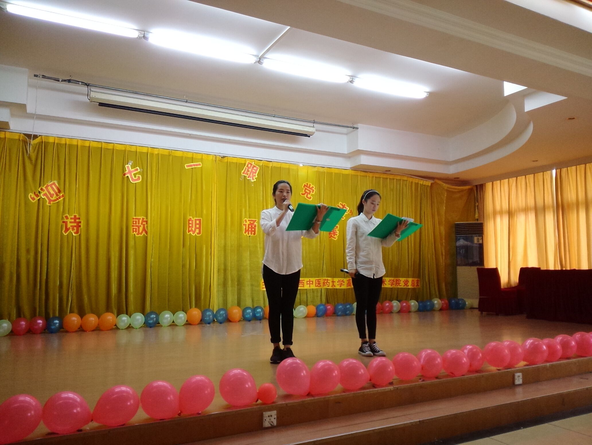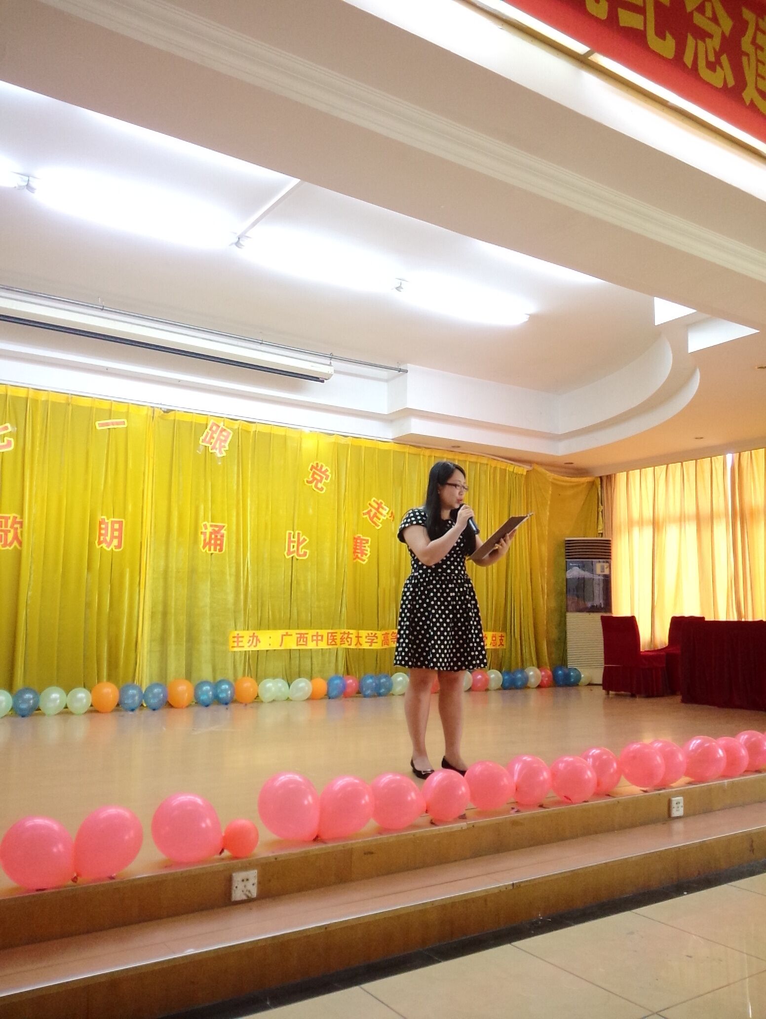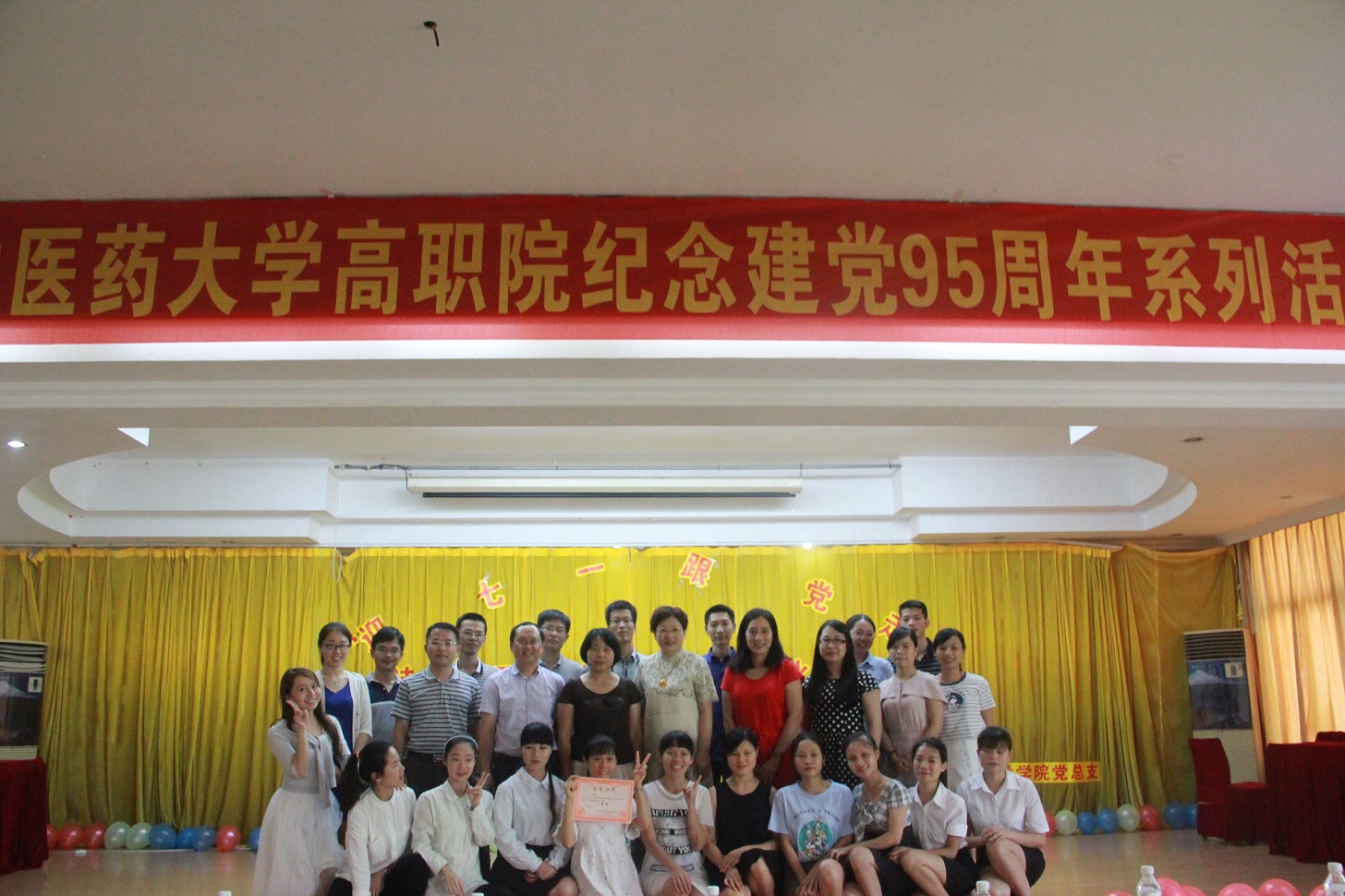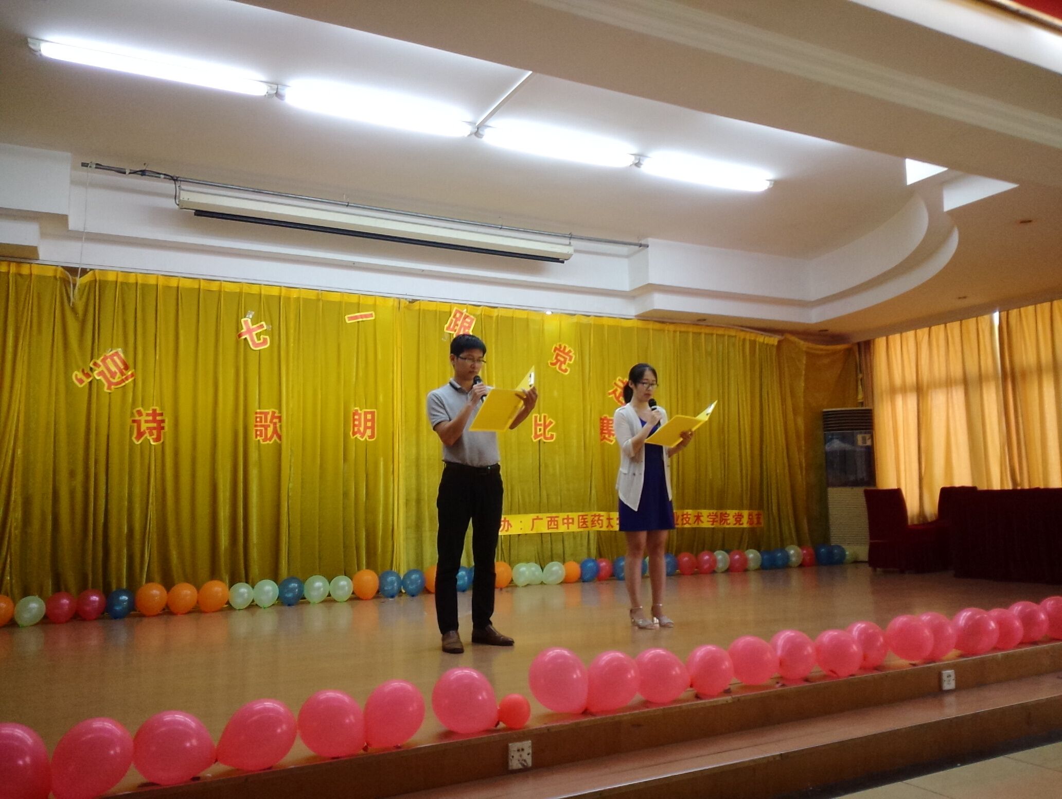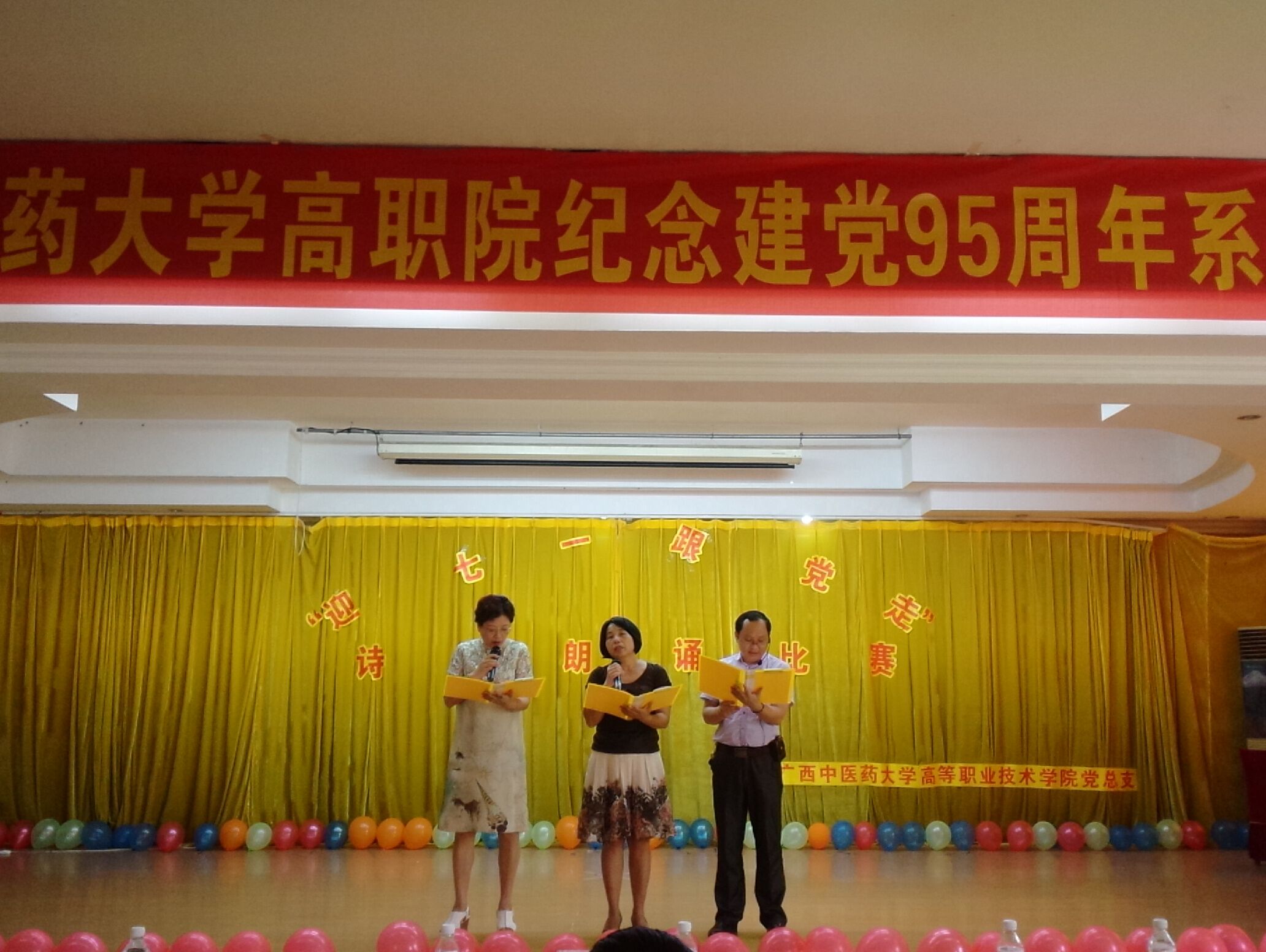 为纪念建党95周年,结合“两学一做”学习教育,弘扬中国共产党的丰功伟绩,展示高职院广大党员的精神风貌,高职院党总支于2016年6月17日下午在明秀校区大俱部成功举办了主题为“迎七一 跟党走”的诗歌朗诵比赛,广西中医药大学高职院党总支书记、院长邓远美,高职院党总支副书记、副院长周琦,高职院副院长杨仕权以及高职院全体教工党员及入党积极分子出席了本次活动。