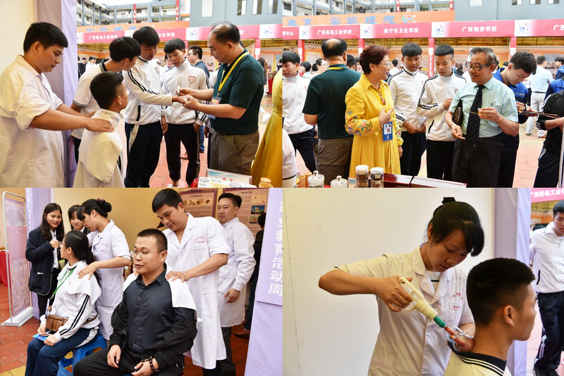 5月8日,广西2019年职业教育活动周启动仪式在北海市中等职业学校举行。广西中医药大学高等职业技术学院、附设中医学校组织代表团前往活动周主会场参展。
