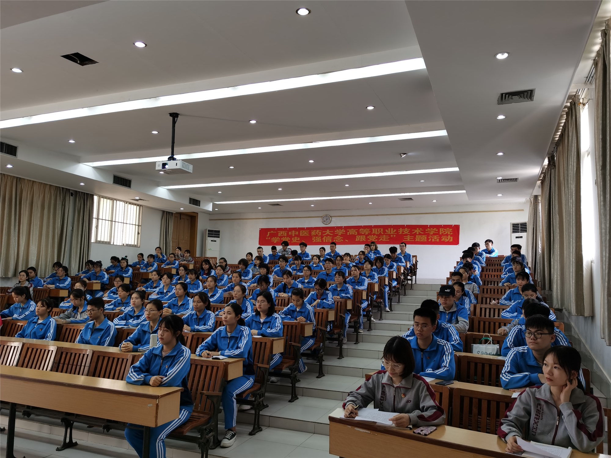 为深入学习习近平总书记在党史学习教育动员大会上的重要讲话精神,庆祝中国共产党成立100周年,引导广大青年厚植爱党、爱国、爱社会主义的情感,5月28日,高等职业技术学院团委在明秀校区开展“学党史、强信念、跟党走”主题教育系列讲座第三讲活动。学院2020级团学社学生骨干、青年马克思主义者培养工程班和推优育苗班全体学员共计128名青年团员参加了主题教育活动。学院党委副书记、院长刘武为本次主题教育活动专门授课。