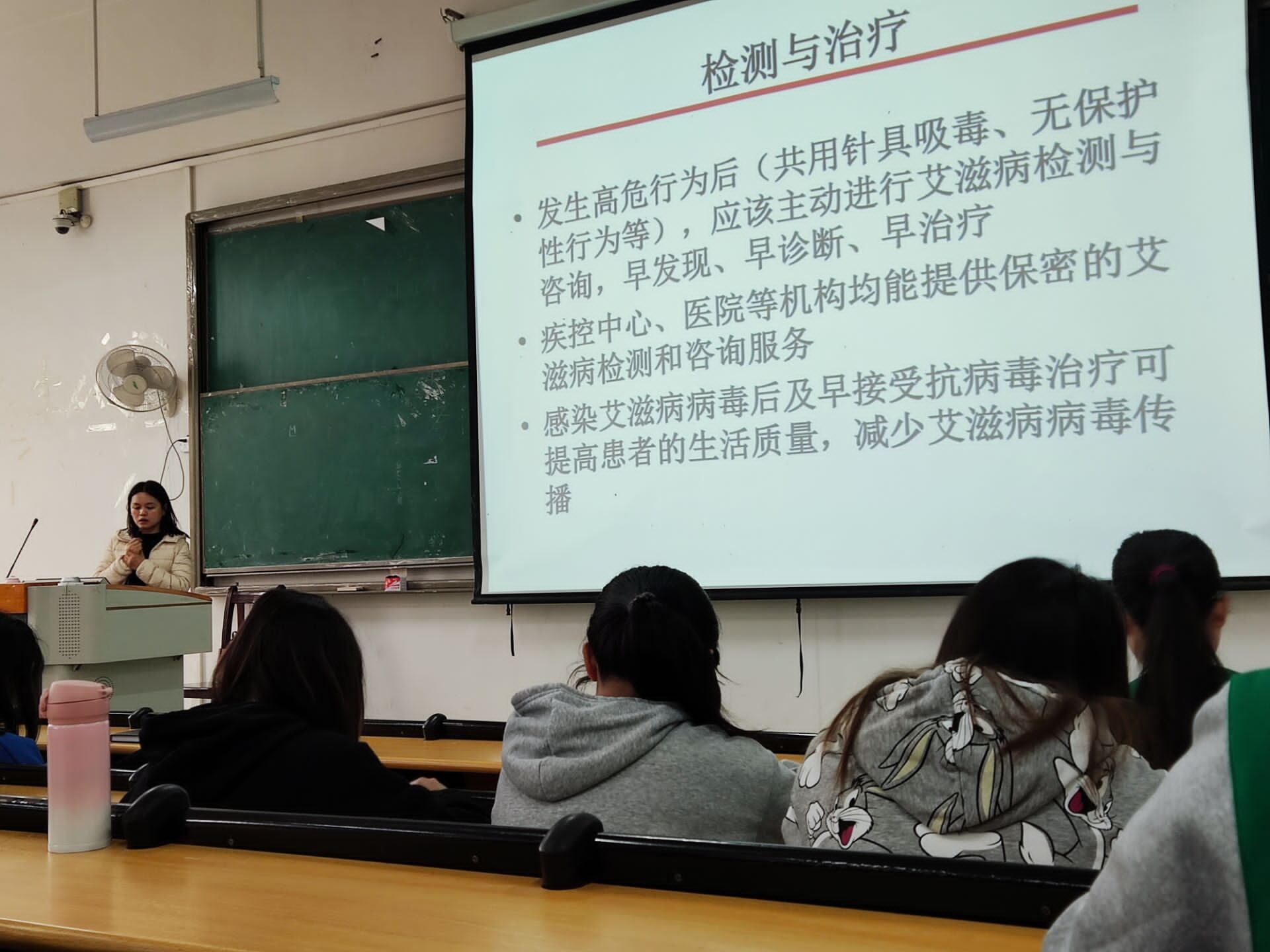 为 强化艾滋病警示性宣传教育,提高大学生自我防范意识 。高等职业技术学院全体新生辅导员:林梓约、吴静思、肖翔、于春秋、叶毅,在 11月 对 约600名 新生分班次开展了大学生 艾滋病防护知识讲座。