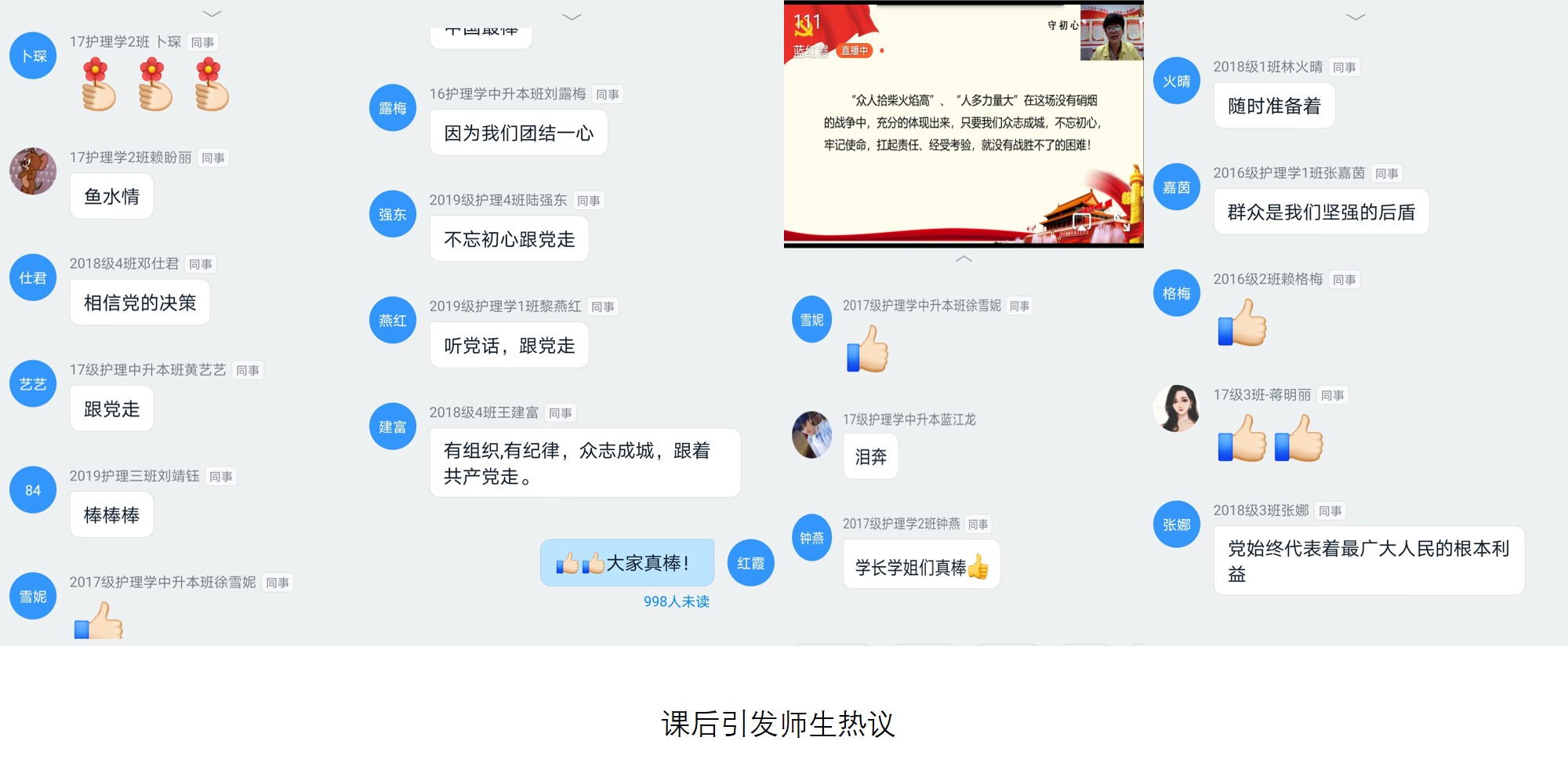 此次线上党课让全院师生看到了新冠疫情防控阻击战中人民的团结一心、医护的勇敢担当、党员的无私奉献,是一次心灵上的熏陶,同时,对加强学生专业认同和树立正确职业价值观具有良好的促进作用。