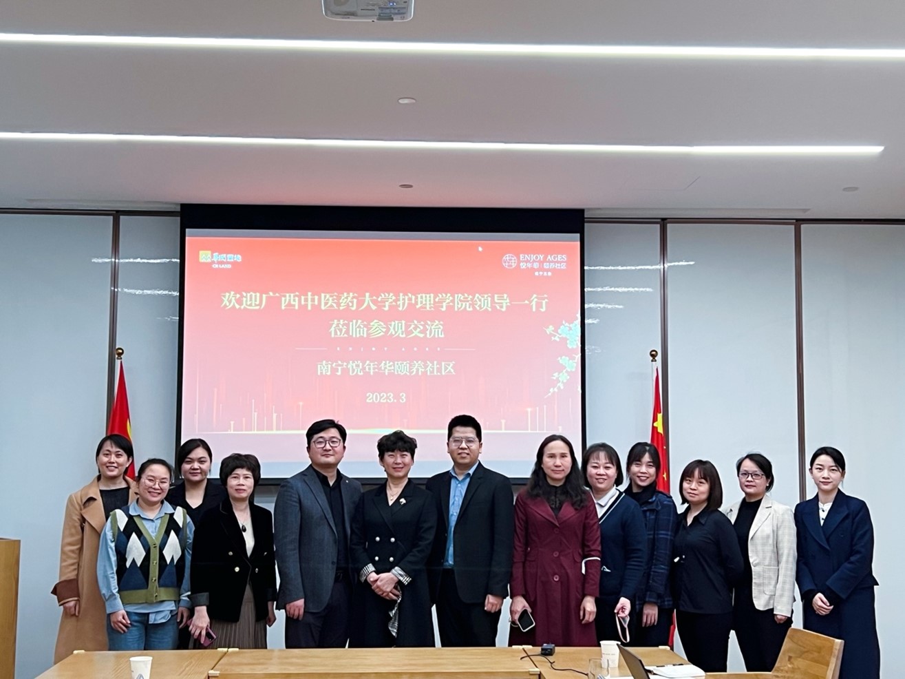 3月6日下午,由护理学院党委书记、院长吴彬带队,护理学院党委副书记韩叶芬,护理学院副院长、“老年健康照护创新研究团队项目”负责人马秋平等组成的调研组一行赴南宁市华润悦年华颐养社区调研养老服务工作。华润悦年华颐养社区活力长者服务部经理李彬陪同调研。