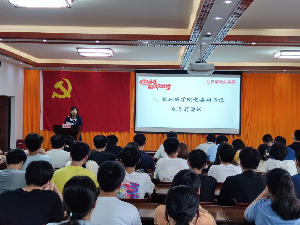 龙春莉在讲话中指出“结对帮扶”活动是学院学风建设常态化开展的特色活动之一,同时也是主题教育“为民解忧办实事”系列行动之一。在2022年的“结对帮扶”活动中,基础医学院2021级36名学生经过帮扶,有18名学生挂科科目较前减少,6名学生实现了“零挂科”。学院将“结对帮扶”活动作为“党建+学风建设”的重要举措并长期开展。党员教师踊跃报名参加本次“结对帮扶”活动,与学生见面谈心,传授学习方法,发挥了党员教师的先锋模范作用。接着,龙春莉用古诗名句“江东子弟多才俊,卷土重来未可知”鼓励同学们不气馁,端正学习态度,激发学习内驱力,改进学习习惯和方法,在帮扶导师的带领下、同学的帮助下,树立消灭补考、取得优异成绩的信心。