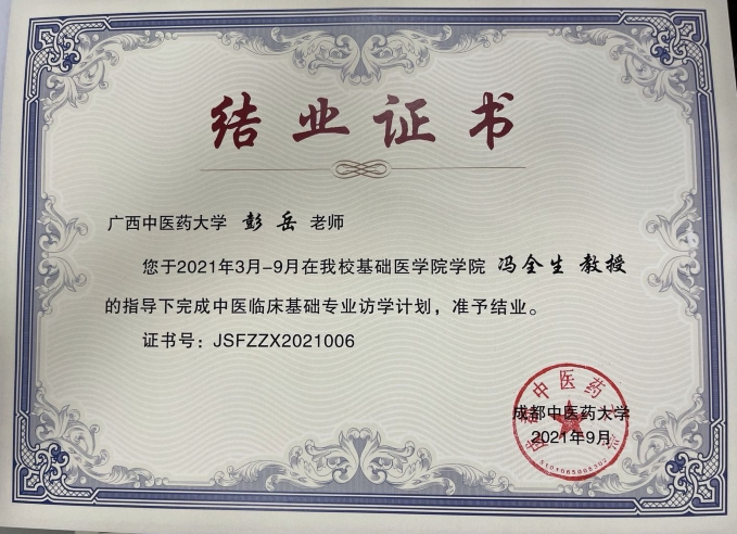 廖丹教授、彭岳教授近期完成访问学者学习 发布时间:2025-05-08 10:55:17 浏览次数:次 【字体:小大】 廖丹教授完成美国圣约翰大学访问学者学习 彭岳教授完成成都中医药大学访问学者学习 分享到: 【打印正文】