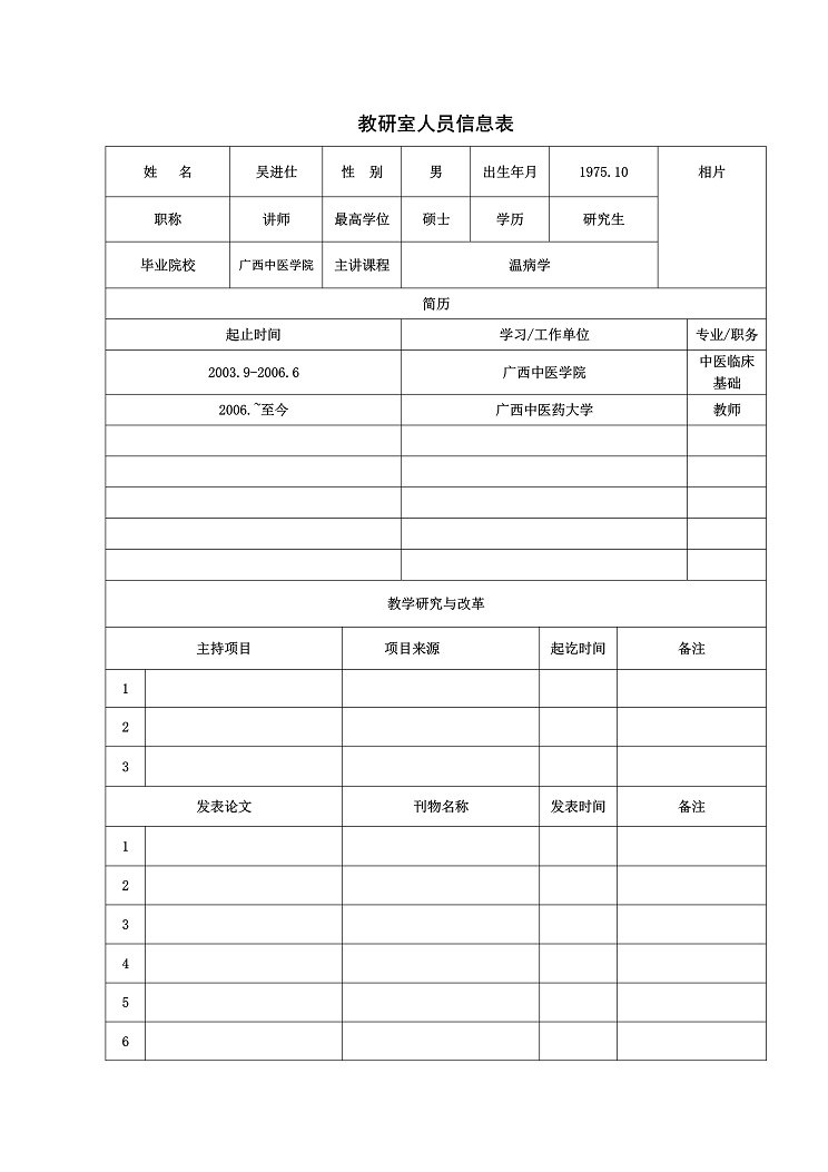 从事中医温病学教学、临床和科研工作20余年,自1999年7月至2003年8月在从事临床实践工作,2003年9月至2006年6于在广西中医药大学师从三代御医之传人艾军教授、博士生导师,攻读硕士研究生,获医学硕士学位,2006年7月至今在广西中医大学温病学教研室历任助教、讲师。主要研究方向温病热郁瘀相关病机理论与临床研究。创新擅长融会贯通把内经、伤寒论、温病学等中医经典融为一炉进行教学工作;并把温病理论运用到临床实践中。主持校级科研课题2项,公开发表学术论文10余篇。