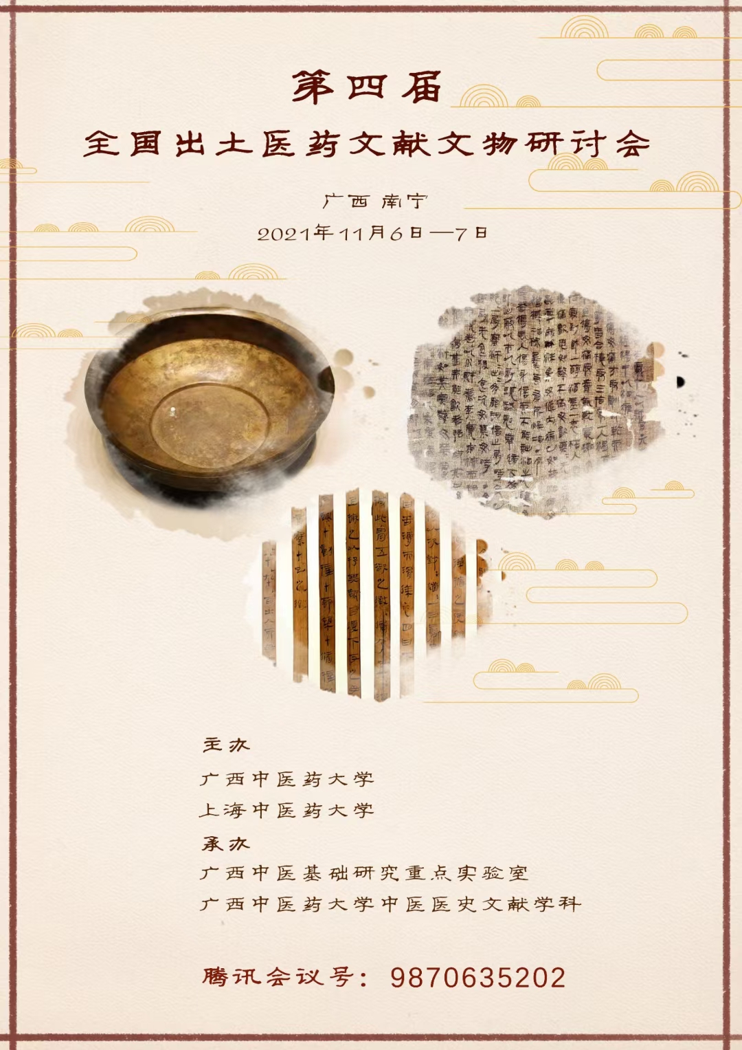 第四届全国出土医药文物文献研讨会在我校顺利召开 发布时间:2023-05-08 14:27:53 浏览次数: 次 【字体:小 大】 来源:本站原创 作者:医古文教研室 发布时间:2021-12-07 15:41:50 浏览次数:54 次 【字体:小 大】 2021年11月6日-7日,第四届全国出土医药文献文物研讨会在我校召开。会议由我校与上海中医药大学联合主办,广西中医基础研究重点实验室与广西中医药大学中医医史文献学科承办。医古文教研室承担了会议组织工作。 会议邀请了来自中国社科院、中国文化遗产研究院、中国中医科学院、清华、复旦等多所科研单位、文博院所及高校学者专家作相关学术报告。我校部分师生通过网络直播或现场旁听的形式参与会议。会议报告内容丰富,精彩纷呈,令与会师生受益匪浅。会议宣传海报 分享到: 【打印正文】