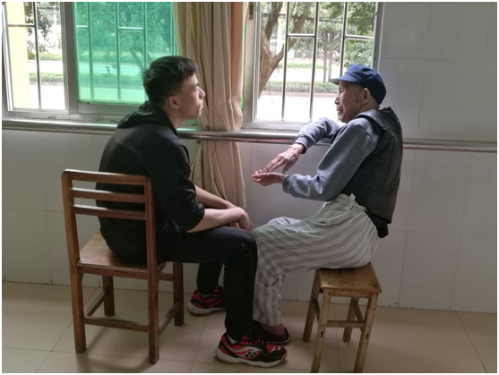 活动中,同学们与老年人互动交谈、给老人献礼以及为老人准备晚餐。活动前,活动负责人先将全体同学分成几个小组并分配好各组任务,确保了活动有效、有序的进行。活动中同学们各司其职,与老人相处融洽,欢声笑语萦绕在庭院中。