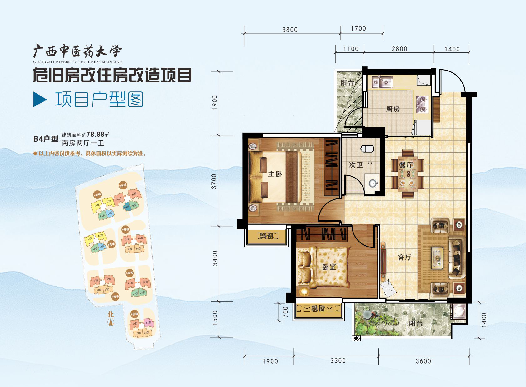 两房两厅一卫(约78.88㎡):2号楼(B4户型)