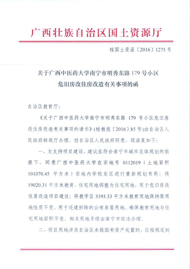 取得《关于广西中医药大学南宁市明秀东路179号小区危旧房改住房改造有关事项的函》 发布时间:2019-08-09 10:28:20 浏览次数:次 【字体:小大】 2016年7月21日,取得广西壮族自治区国土厅《关于广西中医药大学南宁市明秀东路179号小区危旧房改住房改造有关事项的函》(桂国土资函〔2016〕1275号)。 分享到: 【打印正文】