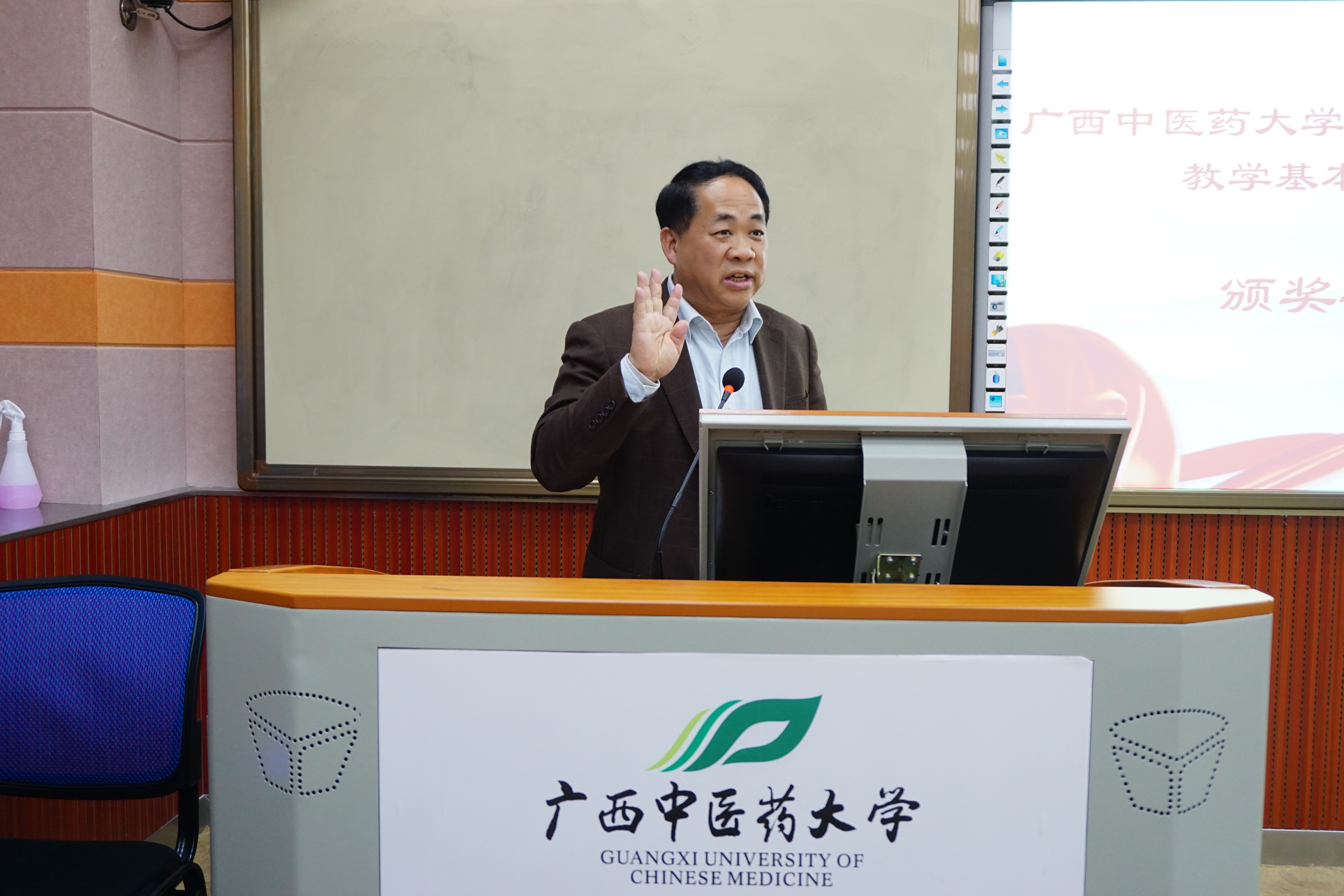 在颁奖仪式上,广西教学名师、校督导组副组长辛宁教授从教学内容、教学设计、教学方法、教学手段、语言教态、授课技巧、教学互动、教学艺术等方面对比赛进行了点评。广西教学名师罗伟生副校长也对比赛进行了点评和总结,他指出,我校坚持举办青年教师教学基本功大赛,不断优化比赛规则、创新比赛内容,已使比赛成为我校青年教师互相交流、学习和展示的一个重要平台,此次比赛赛制新颖,内容丰富,参与范围广泛,让许多青年教师得到锻炼,有效地促进了青年教师教育教学能力的提升,进一步调动了青年教师投身教学工作的积极性和主动性,达到了相互借鉴、共同提高的目的。但不足之处在于,参赛选手水平仍然参差不齐,部分选手缺乏经验;课件制作虽然精美但欠缺规范和标准,部分教师课堂互动不够,缺乏教学艺术。最后,罗伟生副校长还谈了几点感受,他认为将正确的教学理念和恰当的教学方法相结合是搞好教学活动的基础,全面发展不忽略每一个细节是在比赛中取得高分的基础,只有全面发展,全情投入,才能成为一名优秀的教师。