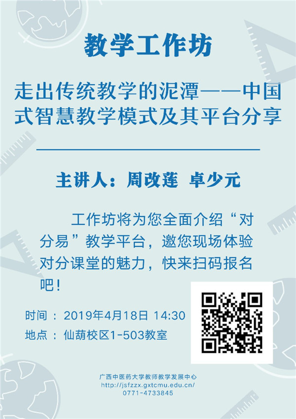 关于开展“走出传统教学的泥潭——中国式智慧教学模式及其平台分享”工作坊的通知 来源:教师教学发展中心 作者:叶莎莎 发布时间:2019-04-16 09:59:51 浏览次数:次 【字体:小大】 分享到: 【打印正文】