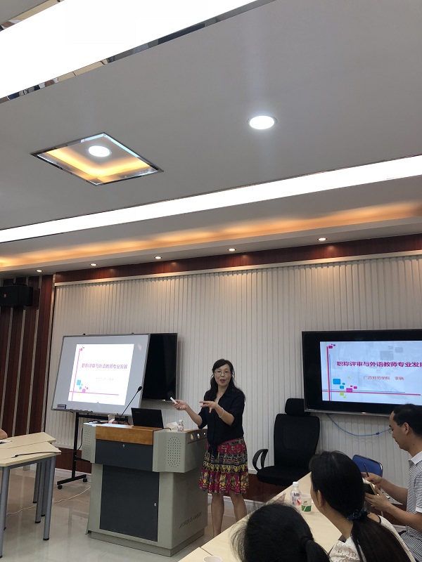5月15日下午,以“外语教师学术发展与职称评审”为主题的专题讲座在我校教学楼1-503沙龙教室举行。本次讲座由科技处委托外语部举办,邀请了广西师范学院外国语学院院长李晓教授主讲。外语部全体教师、管理及教辅人员参加此次讲座。