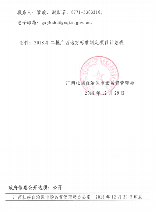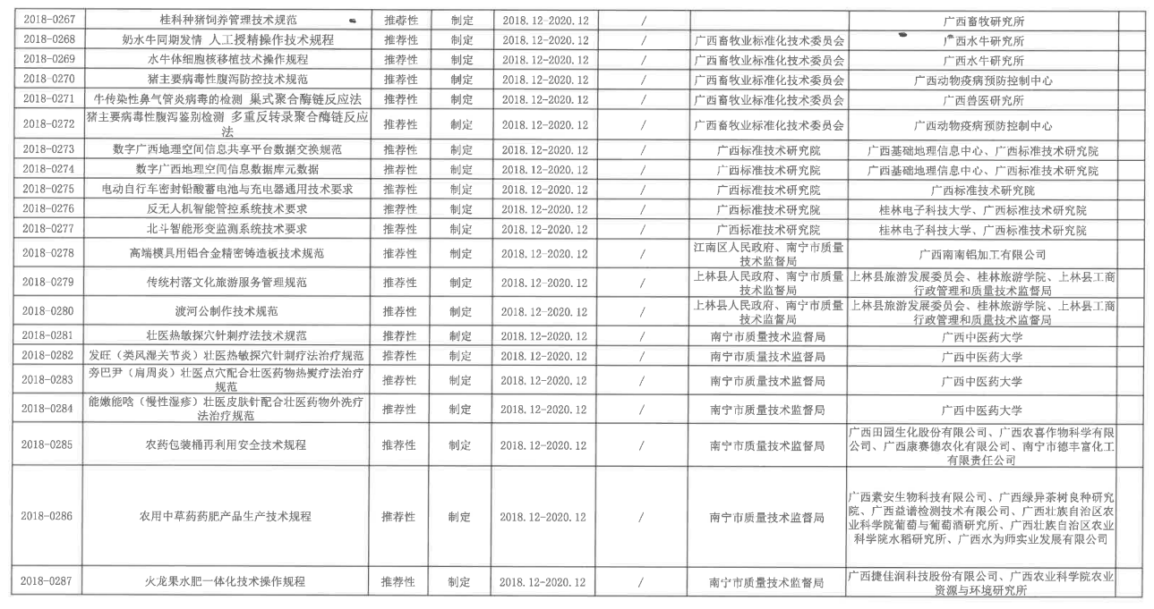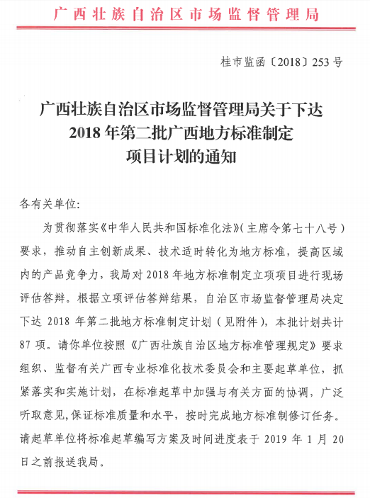 近日,根据《广西壮族自治区市场监督管理局关于下达2018年第二批广西地方标准制定项目计划的通知》(桂市监函[2018]253号)获悉,我校有4个项目被自治区市场监督管理局立项,成为2018年第二批广西地方标准制定项目,立项名单详见表一。
