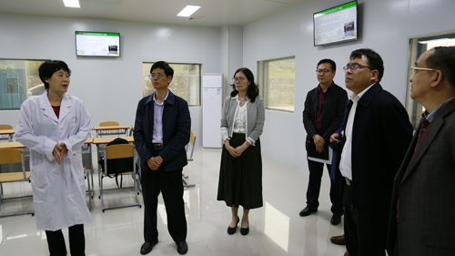 钟会超(左二)在广西中医药大学副校长冷静(左三)陪同下参观广西中医药大学石墨烯生物医药应用技术研究院和药学院