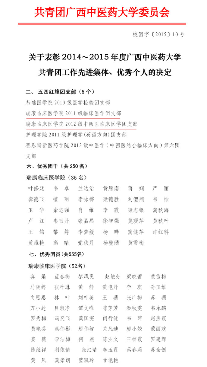 近日,共青团广西中医药大学委员会发布通知,公布2014-2015年度获得学校共青团工作先进集体和优秀个人名单。我院临床医学院2011级临床医学团支部、2012级中西医临床医学团支部荣获“五四红旗团支部”称号,叶修廷等35人荣获“优秀团干”称号,宾娟等52人荣获“优秀团员”称号。