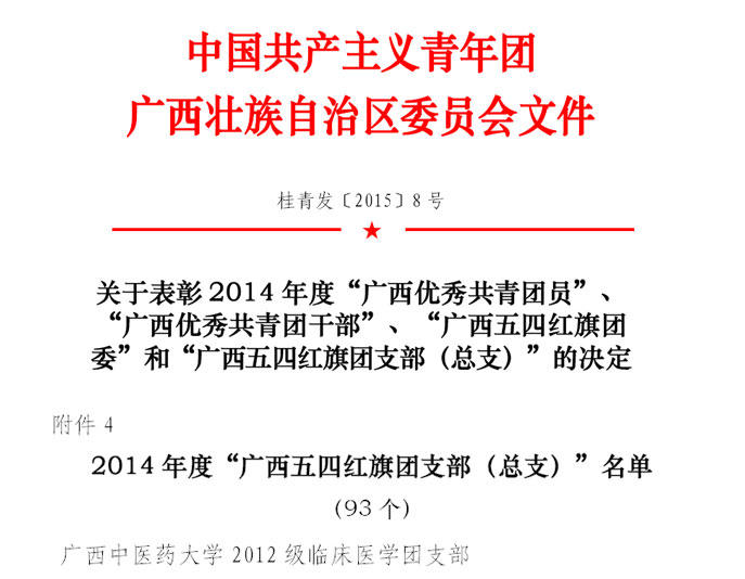 喜讯:我院临床医学团支部荣获2014年度“广西五四红旗团支部(总支)”称号 作者:覃超 发布时间:2015-05-08 10:20:47 浏览次数:次 【字体:小大】 近日,从共青团广西区委办公室传来喜讯,我院临床医学团支部荣获2014年度“广西五四红旗团支部(总支)”称号。 此次获表彰的广西五四红旗团委(团支部),紧紧围绕党政工作大局,认真落实我区共青团重点工作部署,切实履行团的基本职能,团结带领广大团员青年立足岗位创先争优,在青年中有较强的吸引力和凝聚力。 分享到: 【打印正文】