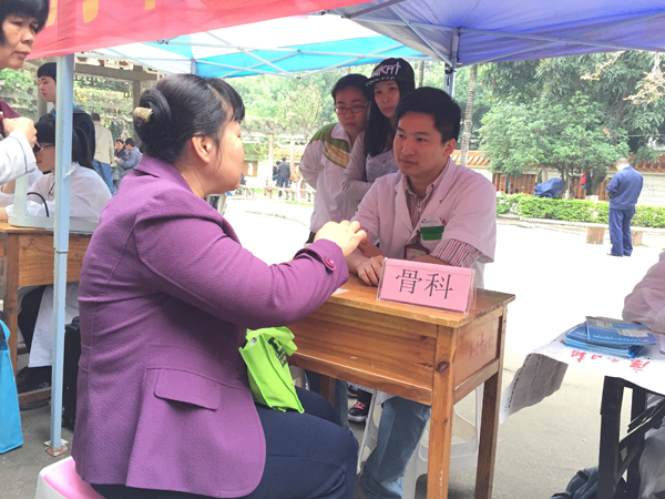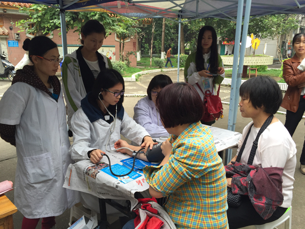 义诊现场分为三个部分,分别为手法按摩、测量血压与骨科义诊。我院中西医与临床专业的大学生青年志愿者们提前两周就开始了认真的筹备工作,他们利用课余时间训练按摩手法,力求能够为明秀小区的居民们提供最好的按摩治疗服务。义诊活动吸引了附近的居民纷纷前来。我院学生将平时课堂上所学的知识与技能应用于实践操作中,不仅奉献了爱心,也锻炼了实际操作能力。